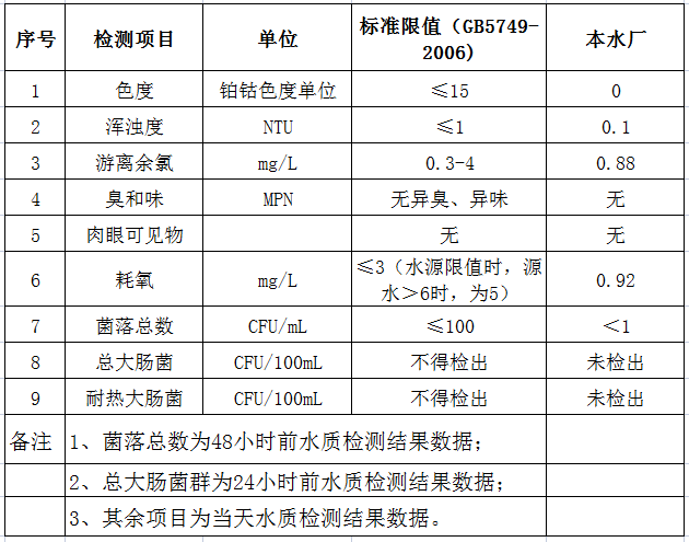 先生店水廠2021年9月18日出廠水水質(zhì)公告