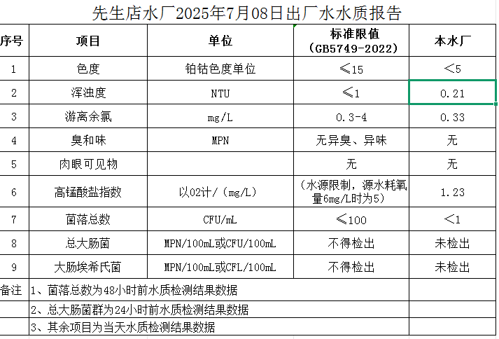 先生店水廠2025年7月08日出廠水水質(zhì)報(bào)告