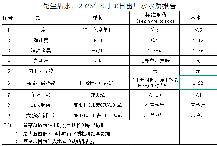 先生店水廠2025年8月20日出廠水水質(zhì)報告