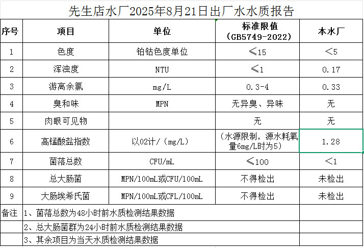先生店水廠2025年8月21日出廠水水質(zhì)報告