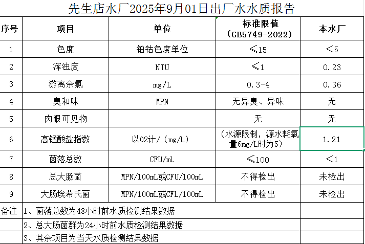 先生店水廠2025年9月01日出廠水水質(zhì)報(bào)告