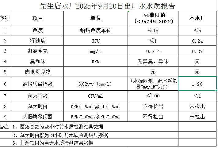 先生店水廠2025年9月20日出廠水水質(zhì)報(bào)告