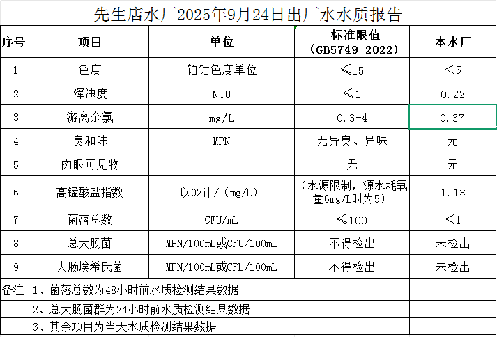 先生店水廠2025年9月24日出廠水水質(zhì)報告
