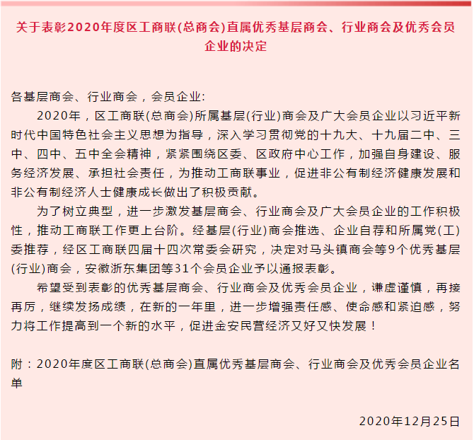 2020年度區(qū)工商聯(lián)(總商會(huì))直屬優(yōu)秀基層商會(huì)、行業(yè)商會(huì)及優(yōu)秀會(huì)員企業(yè)名單