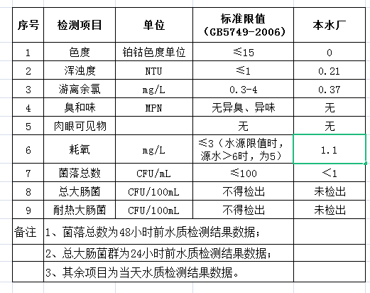 先生店水廠2021年5月5日出廠水水質(zhì)公告