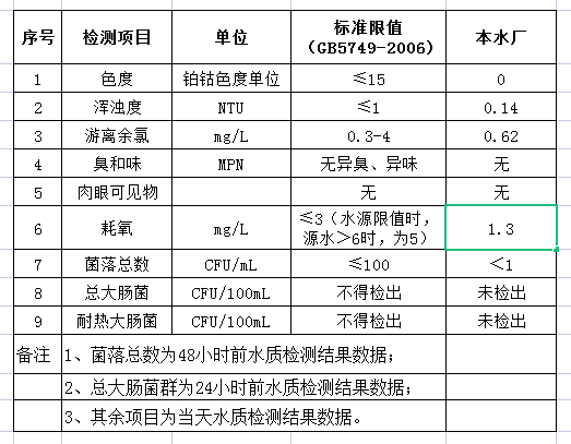 先生店水廠2021年6月29日出廠水水質(zhì)公告