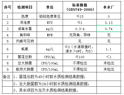 先生店水廠2021年8月5日出廠水水質(zhì)公告
